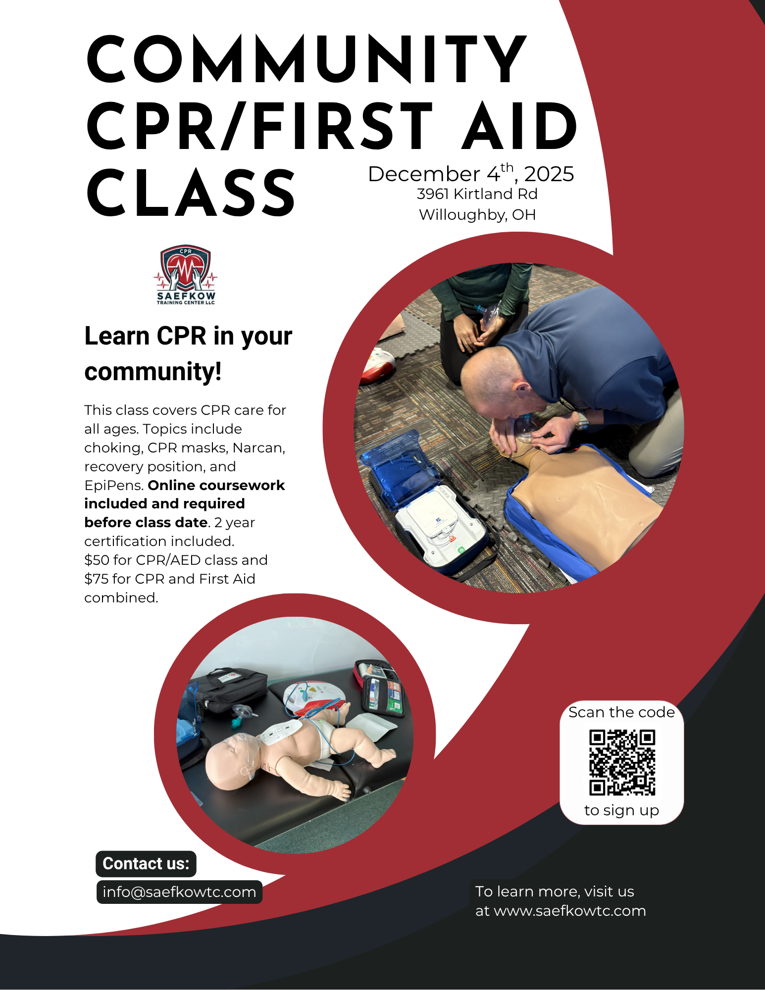 Join us for our next CPR/AED & First Aid Certification Course at Saefkow Training Center! Learn the skills and confidence to respond in an emergency — whether at work, home, or out in the community.