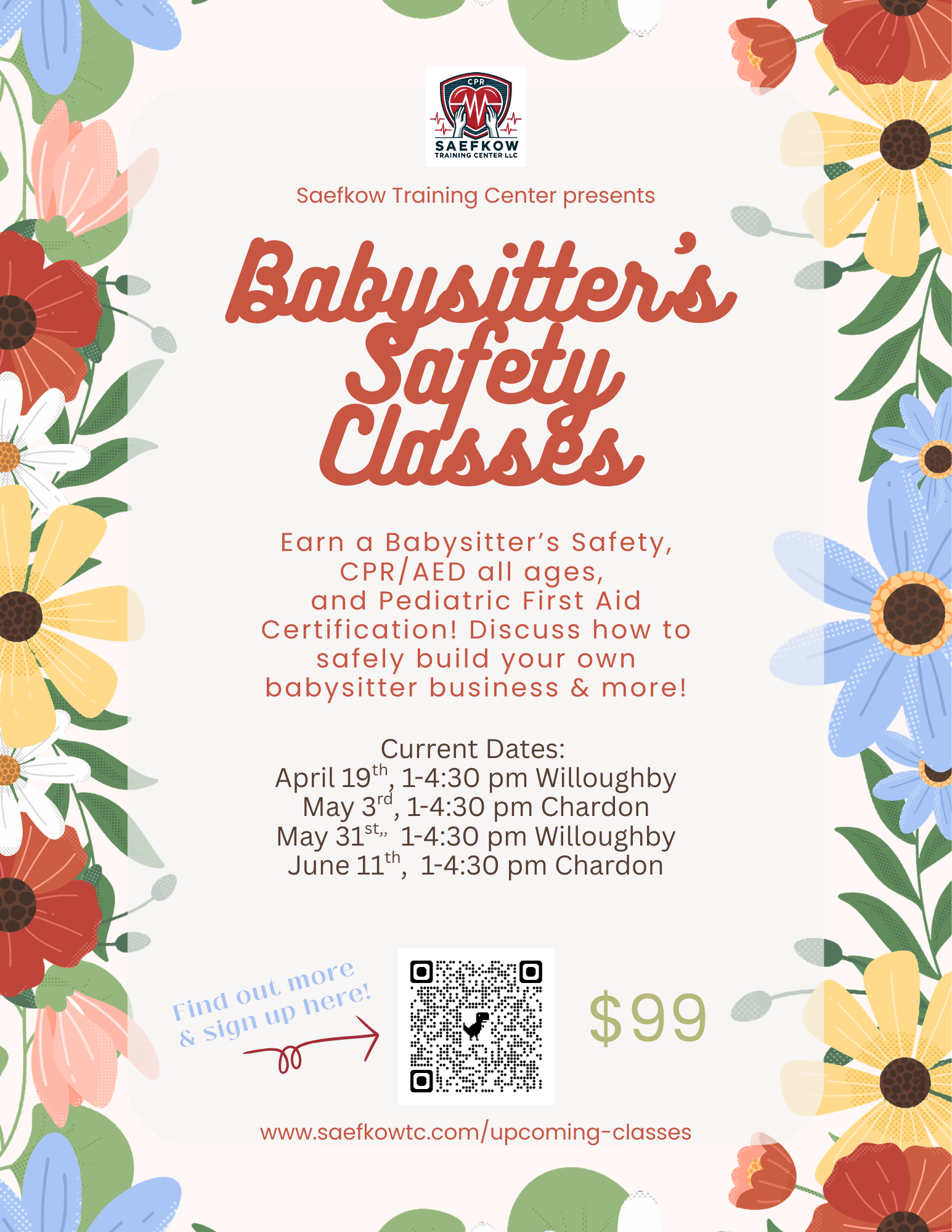 Flyers for our upcoming CPR/AED/First Aid, Babysitter's Safety, and free community courses are listed below. To sign up for any of the safety classes listed below, please contact us via the contact button listed on the class description. To see more class dates, refer to the calendar or click the buttons below.